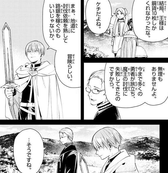 王様に挨拶をし、勇者ヒンメルの一行が冒険に旅経つ頃の記憶です。王様は銅貨10枚しかくれなかったようで、アイゼンとフリーレンはケチだ、と文句を言っています。しかし、ヒンメルは地道に討伐依頼を熟して路銀を稼ぐのもいいじゃないか、冒険らしい、と前向きです。