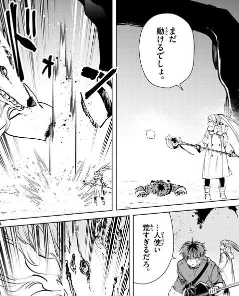 フリーレンがシュタルクに、まだ動けるでしょ、と声をかけると山の主の片方の前脚が吹き飛びます。人使い荒すぎるだろ、とシュタルクがボヤいている隙に、山の主はフリーレンに襲い掛かりますが、フェルンが簡単に魔法で攻撃を防ぎます。