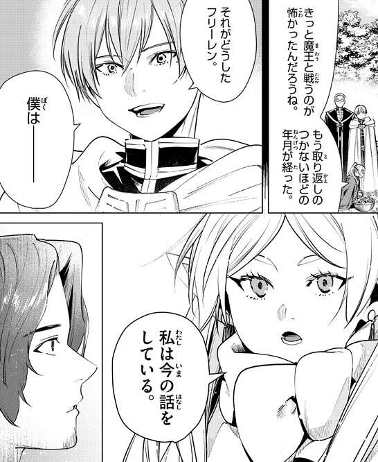 そして、仲間探しは他を当たるようにザインは言い、冒険者になりたかったのも昔の話で、今更だよ、と言います。それを聞いたフリーレンは昔、ヒンメルに一緒に魔王を倒そう、と勧誘された頃の記憶を思い出します。その時フリーレンは、今更だよ、もう五百年以上魔族との実戦はやっていない、もう戦い方も忘れてしまったと、ザインと同じように断っていました。しかし断られても気にせず、僕は今の私をしている、とヒンメルはフリーレンを勧誘しました。それと同じセリフを、フリーレンはザインに言います、私は今の話をしてる、と。