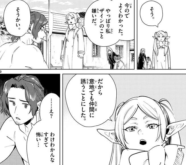 しかしザインは、お前には俺の気持ちはわかんねぇよ、と頑なに拒否します。フリーレンは、今のでよくわかった、やっぱり私ザインのこと嫌いだ、と言います。その上で、だから意地でも仲間に誘うことにした、とフリーレンは意地でもザインを勧誘すると決意します。意外なフリーレンの言葉に、わけわかんなすぎて怖い…、とザインは呟きます。