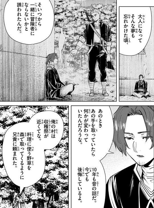 北側諸国アルト森林にて、フリーレンは男の独白を黙って聞いています。男はずっと昔、冒険者にあこがれていて、一緒に小さな冒険を沢山した親友もいました。大人になってそんな夢も忘れかけた頃、その親友から一緒に冒険者にならないかと男は誘われました。あのとき、あの手を取っていたら何かが変わっていたんだろうな、と男は10年も昔の話を今でも公開していました。