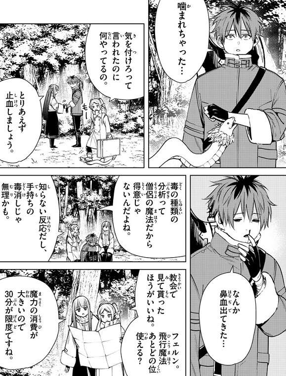男から礼をするからと村によって行くように言われますが、物資の補充がしたいから今日中に大きめの街に行きたいと断り、男とは別れます。男から別れ際に危険な毒性生物が多いから気を付けるように言われますが、シュタルクが蛇に噛まれてしまいます。すぐに鼻血も出て来てしまい、仕方がなくさっきの村まで戻ることにします。