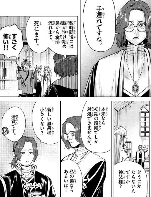 村に戻って神父にシュタルクの毒を見てもらうと、既に手遅れで数時間後には脳が溶け始め鼻から全部流れ出て、死にます、と言われてしまいます。驚くシュタルクに、震えるフリーレンとフェルンです。本来は初期の段階でしか対処できないそうですが、神父の弟ならあるいは…、と話していると、先ほど助けた男が掌サイズの風呂桶を持って部屋に現れます。