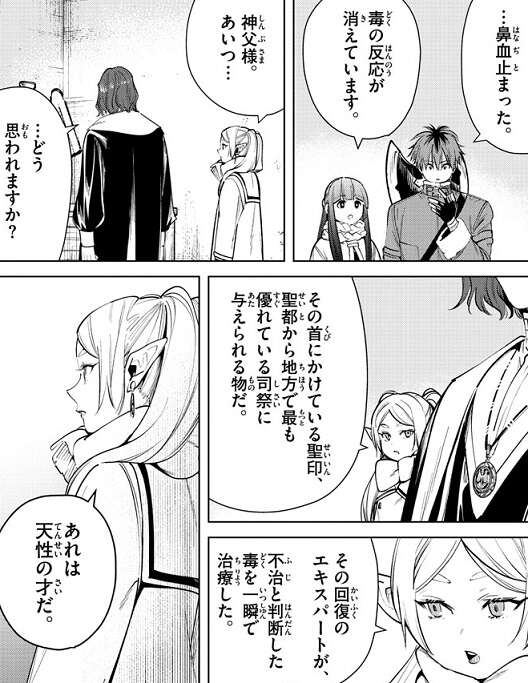 男はザインといい、ザインが肩に手をあてると一瞬で治療して広場の方に行ってしまいます。シュタルクの鼻血は止まり、毒の反応も消えています。フリーレンが神父にザインの事を聞いた時、神父の首にかけている聖印に目が止まります。その聖印は聖都から地方で最も優れている司祭に与えられる物で、その回復のエキスパートが不治と判断した毒を一瞬で治療したザインは天性の才だ、とフリーレンは言います。