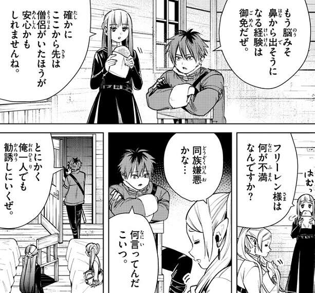 神父は、ザインは子供の頃冒険者になりたいとよく言っていて、兄のような同じ毎日を繰り返すだけの平凡な村の僧侶にはなりたくない、とも夢や希望に満ちた目で言っていたそうです。しかし、今はまるで私の若い頃にそっくりでさぞつまらない人生でしょう、あの子をこの村から連れ出してやってくれませんか?と、神父はフリーレンに願い出ます。フェルンとシュタルクはザインを勧誘することに賛成ですが、フリーレンはザインを勧誘することに一人悩みます。何が不満なんですか?とフェルンが聞くと、同族嫌悪かな…、とはっきりしない答えをフリーレンは口にします。