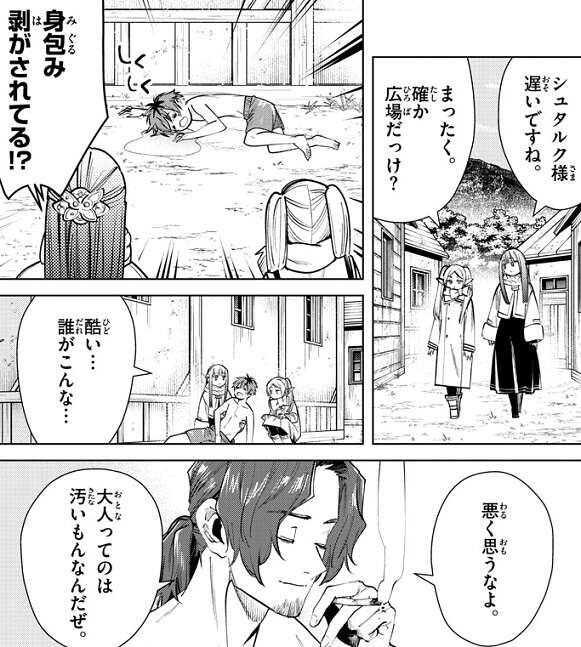 シュタルクは一人でも勧誘に行くと、ザインの所に行きますがザインは酒場でポーカーをやっていました。シュタルクはザインに仲間にならないか?と、言うと、冒険に出る気はないとザインは言いかけますが、これも一興と、ポーカーの勝負に勝てたら仲間になるとシュタルクに言います。暫くして、フリーレンとフェルンがシュタルク探しに行くと、シュタルクは身包みを剥がされていました。ザインは冷静な顔で、大人ってのは汚いもんなんだぜ、と言いますが、ザイン自身も身包みを剥がされています。どうやら、村長の一人勝ちだったようです。