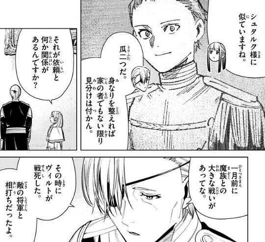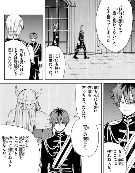 息子のヴィルトとは喧嘩別れだったようで、“お前のかおなんて二度と見たくない”と心にも無い言葉を言ったことを、オルデン卿はずっと後悔しているようです。シュタルクを見つけたときは奇跡だと思ったんだ、とオルデン卿は言いますが、なら尚更ここには残れねぇな、とシュタルクは答えます。シュタルクはアイゼンを思い出しながら、オレも心に無い言葉を言っちまったんだ、と言います。そして、だから旅の思い出話をたっぷりと持って帰らねぇと駄目なんだ、とシュタルクは改めてオルデン卿の願いを断ります。それを聞いて一言、……そうか、とオルデン卿はつぶやきます。