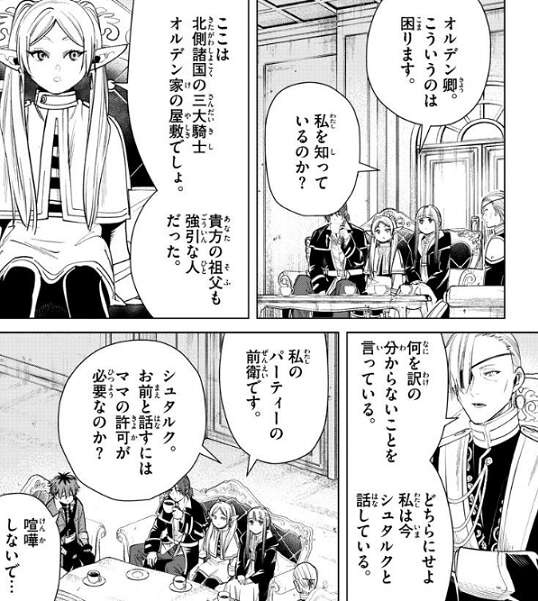 フリーレン達は強引に貴族の屋敷まで連れてこられます。貴族は北側諸国の三大騎士オルデン家の人間で、フリーレンはこの貴族の祖父と会ったことがあるそうです。オルデン卿はシュタルクに依頼があり金を出すと言いますが、フリーレンは馬鹿馬鹿しいと言い屋敷を出て行こうとします。