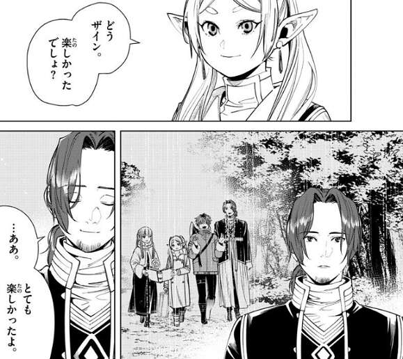 私はヒンメル達に旅立つ勇気と、仲間と過ごす楽しさを教えてもらった、とフリーレンは言い、どうザイン、楽しかったでしょ?と、ザインに質問します。ザインは今までの旅を思い返し、…ああ、とても楽しかったよ、と笑顔でフリーレンに答えます。