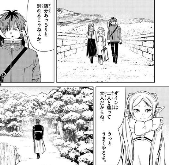 寒波の時期も終わり、猛吹雪も収まっています。ザインは、やっぱり俺はゴリラを追いかけるよ、もう後悔するつもりはないんだ、と言い、フリーレンも、わかっているよ、とザインの旅立ちを見送ります。一人だとこんなに静かなんだな、とザインは一人で歩きながら呟きます。一方、別れたフリーレン達も旅立ちますが、しばらくしてシュタルクが、随分あっさりと分かれるじゃねぇか、とフリーレンに言います。すると、ザインは二人と違って大人だからね、きっとうまくやるよ、とフリーレンは答えます。