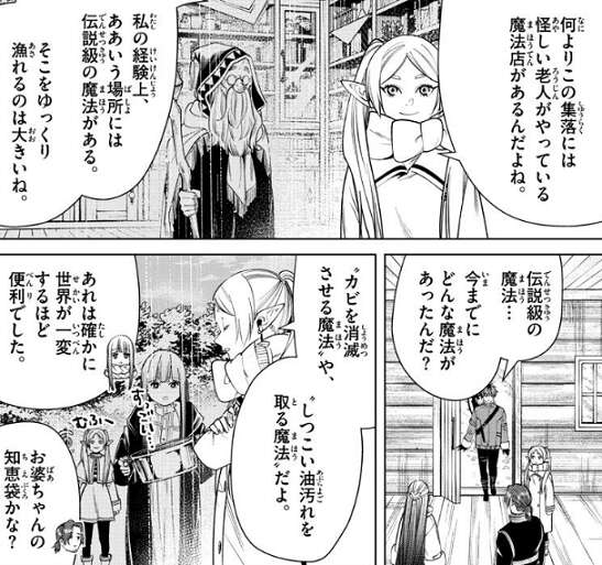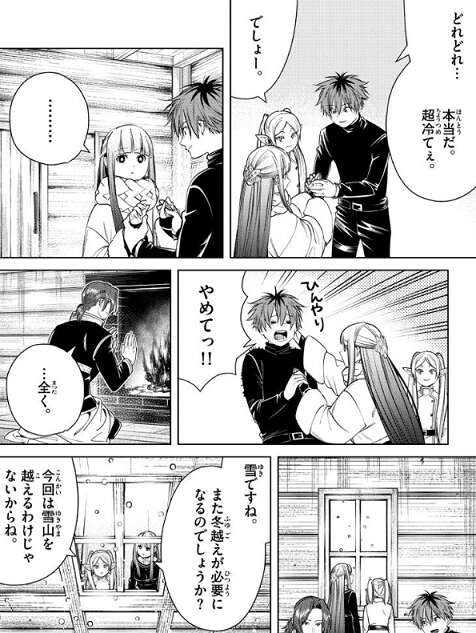 小屋の外では雪が降り始め、フェルンがまた雪越えが必要になるか心配します。フリーレンは、今回は雪山を超えるわけじゃないからね、と気にしませんが、次の日には猛吹雪になっています。村の人に聞くと、この地方の寒波は一月は続くとの事で、しかたなくザインは結論を一月先に延ばし、フリーレン達も出発は一月先にします。フリーレンはこの集落にある怪しい老人がやっている魔法店に興味があるようで、そこに伝説級の魔法がある事を期待します。シュタルクが今までにどんな魔法があったんだ?と聞くと、“カビを消滅させる魔法”や、“しつこい油汚れを取る魔法”とフリーレンは答えますが、おばあちゃんの知恵袋かな?と、ザインからツッコまれます。とにかく今は待つしかないとフリーレンが言うと、ザインも、…もうしばらくは一緒にいることになりそうだな、と話します。
