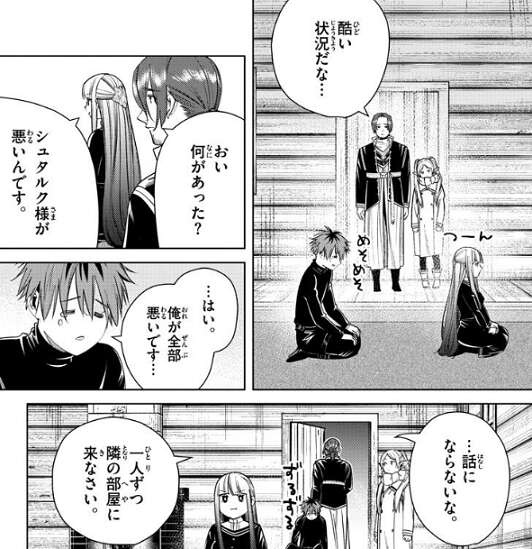 まずはシュタルクから話を聞くと、シュタルクはこの小屋に来たばかりの時、フェルンにやられた頬に冷たい手を当てる、という行為をフェルンにやり返したようです。すると、フェルンがキレてしまったようで、ザインは、ガキかよぉ…と呟きます。ザインがこのままでいいと思うか?と聞くと、…仲直りしたいです…、とシュタルクが言い、仲直りしたいのならちゃんと相手にちゃんと相手にそう話すんだ、とザインは忠告します。
