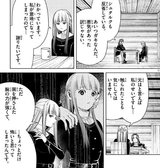 さらにザインは、今度はフェルンから話を聞くと、私が意地になってしまったので…、謝りたいです、とフェルンは言います。フェルンは触られたことは気にしていないようですが、ただ肩を押さえた腕の力が強くて、…ちょっとだけ怖いと思ってしまったんです、とフェルンはザインに気持ちを説明します。