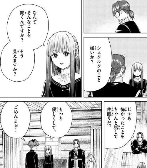 ザインはフェルンに、シュタルクのこと嫌いか?と聞くと、なんでそんなことを聞くんですか?そう見えますか?と、フェルンは答えます。ザインはフェルンに、怖かったことをちゃんと話して仲直りだ、と伝えます。その後、もっと優しくして、とフェルンが言い、ごめんよぉ…、とシュタルクが謝り二人は仲直りします。