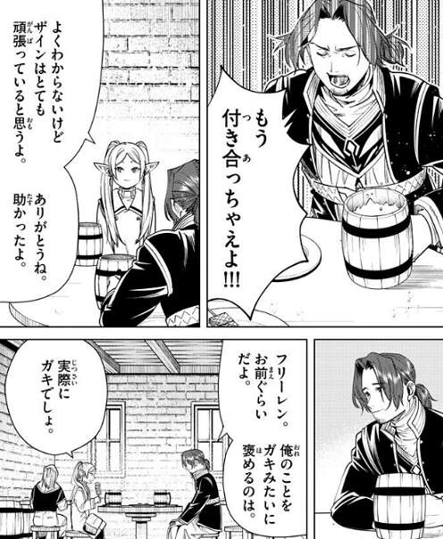 その後、ザインとフリーレンは酒場で酒を飲みますが、ザインはフェルンとシュタルクについて、もう付き合っちゃえよ!!!と、つい叫んでしまいます。そんなザインに、よくわからないけどザインはとても頑張っているよ、ありがとうね、助かったよ、とフリーレンはザインを褒めます。