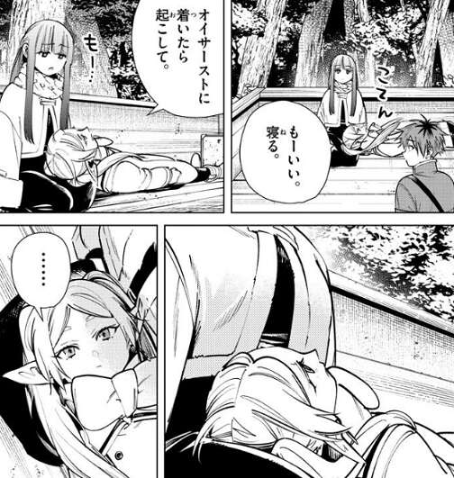 途中で馬車を捕まえて、馬車に乗って移動しているフリーレンですが、一級魔法使いの試験の話に飽きてフェルンの膝で寝ようとします。しかし、フェルンの胸が大きく空が半分しか見えないのがショックだったのか、やっぱり寝るのをやめます。フリーレンは前回同様、フェルンがもう子供ではないと思い知らされます。
