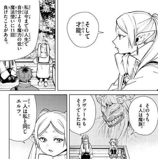 話は一級魔法使いの試験の話に戻り、フリーレンは魔法使いの強さを決めるのは魔力だけじゃないと言います。努力と根性、そして才能だと言い、フリーレンは今までの人生で自分よりも魔力の低い魔法使いに負けたことが11回あると告白します。そのうち4人はクヴァールのような魔族、一人はエルフ、そして残り6人は人間だと言います。