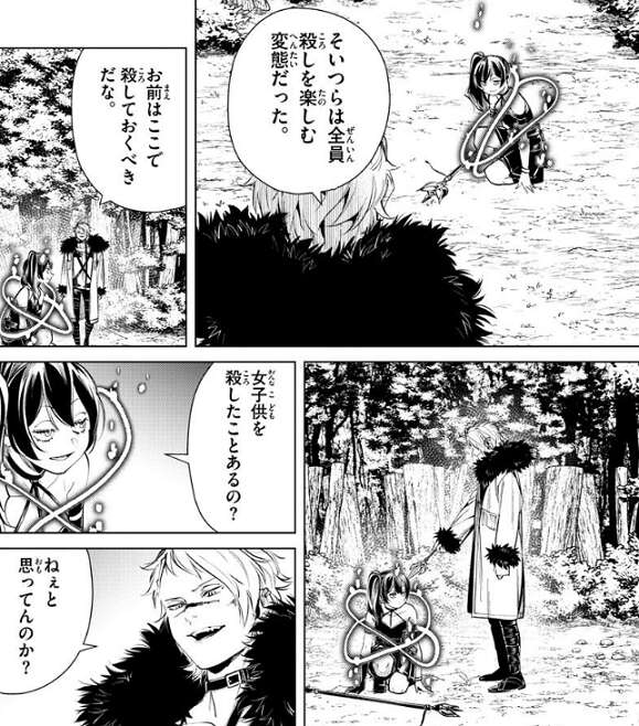 ヴィアベルは、俺がお前の立場なら殺すために首を狙う、それで戦いは終わりだからな、と言い、戦場でも同じようなことをした奴らはいた、そいつらは全員殺しを楽しむ変態だった、と言いユーベルをここで殺しておくべきだな、と殺そうとします。その時、女子供を殺したことはあるの?と、ユーベルはヴィアベルに質問して時間稼ぎをしようとし、ヴィアベルも時間稼ぎに乗ります。