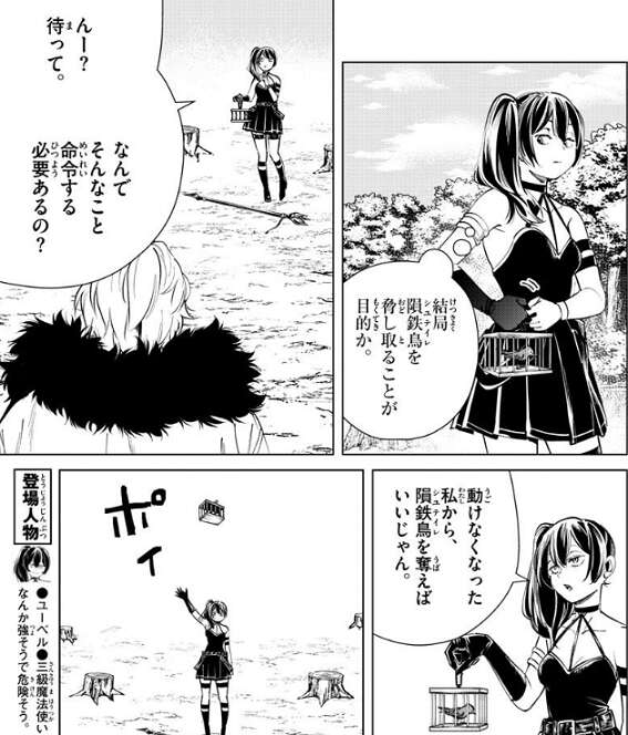 仕方なくユーベルは隕鉄鳥を渡そうとしますが、渡す直前にヴィアベルが何故そんなことを命令する必要があるのか、ユーベルは疑問に思います。動けなくなった私から隕鉄鳥を奪えばいいじゃん、とユーベルは言うと隕鉄鳥を入れた籠ごと空中に放り投げます。