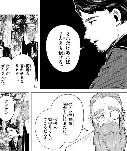 リヒターはデンケンに、フリーレンを一分足止めしろ、と言い、それだけあれば2人とも殺せる、とデンケンに言います。しかし、デンケンはリヒターに、たった三時間寝かしつけるだけ、ガキの御守りくらいできるだろう、とラヴィーネとカンネを殺さないように言います。