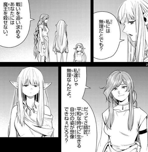 フランメは、この子はいつか魔王を倒すよ、きっとこういう魔法使いが平和な時代を切り開くんだ、とゼーリエに言います。それを聞いて、私には無理だとでも?と、不服そうにゼーリエは言いますが、戦いを追い求めるあなたには魔王を殺せない、とフランメは言います。そして、平和な時代に生きる自分の姿が想像できねぇだろう?と、フランメはゼーリエに問いかけるように言います。