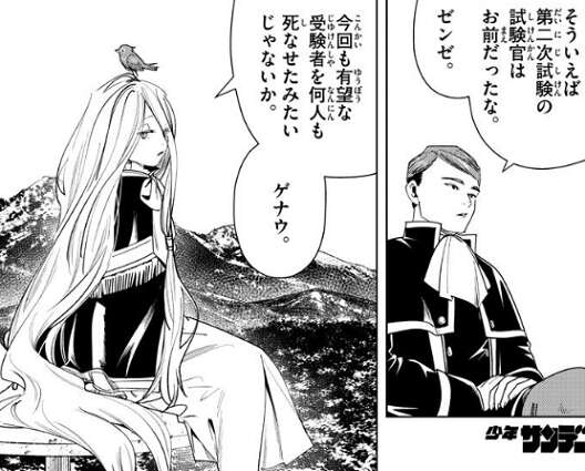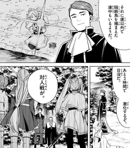 ゼンゼは、魔法使いの試験に魔力探知が通用しない獲物を選ぶなんて、と人が悪いとゲナウを非難します。捕まえられるかどうかは運任せで、争奪戦に見せかけた対人戦だ、とゼンゼは言いますが、運も実力のうちだとゲナウは言います。それに運以外で隕鉄鳥を捕まえた連中もいるようだ、とフリーレン達の第2パーティーの事を思い浮かべます。あと3時間で日没となり、第一次試験となるので対人戦が激化するとゲナウは予想します。