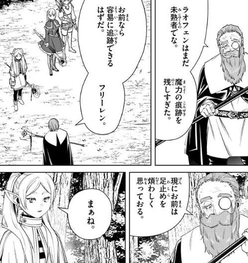 すると、ラオフェンはまだ未熟者でな、魔力の痕跡を残しすぎた、お前なら容易に追跡できるはずだ、フリーレン、とデンケンはフリーレンの名前を言います。フリーレンは、私のこと知っているんだ、とデンケンに言うと、儂等の世代でその名を知らぬ魔法使いなどない、とお前は勇者一行の魔法使い、フリーレンだ、とデンケンは断言します。