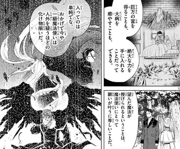 ゼーリエは一級魔法使いの座に就いた者に特権として、一つだけ望んだ魔法を授けると約束した、とリヒターは話します。望んだ魔法が授けられるということは、魔法使いにとって願いが叶うことに等しいことだ、おかげで今や一級魔法使いは人外を疑うほどの化け物ぞろいだ、とリヒターはフリーレンに言います。