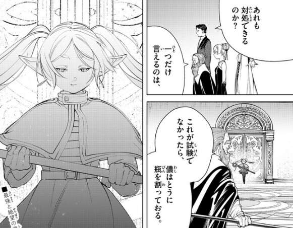 デンケンのチームが扉の先に進むと、部屋がありその部屋にはフリーレンの複製体がいました。デンケンは、これが試験でなかったら、儂はとうに瓶を割っておる、と言いながら杖を構えて、フリーレンの複製体に備えます。