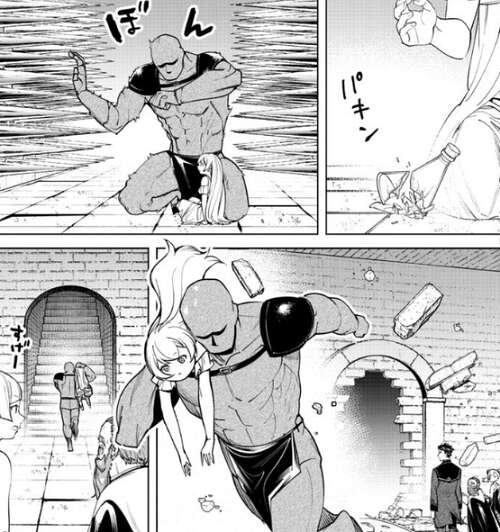 多分、第1パーティーのレンゲと言う名前の受験生だと思いますが、罠にかかってしまいこのままだと串刺しになってしまいそうです。デンケンが魔法で壁を壊し助け出そうとしますが、壁は全く壊れず仕方なくデンケンは瓶を割って脱出用のゴーレムを呼び出します。脱出用のゴーレムがレンゲを助け出し、迷宮の外まで運び出します。しかし、早速一人が不合格になってしまいます。