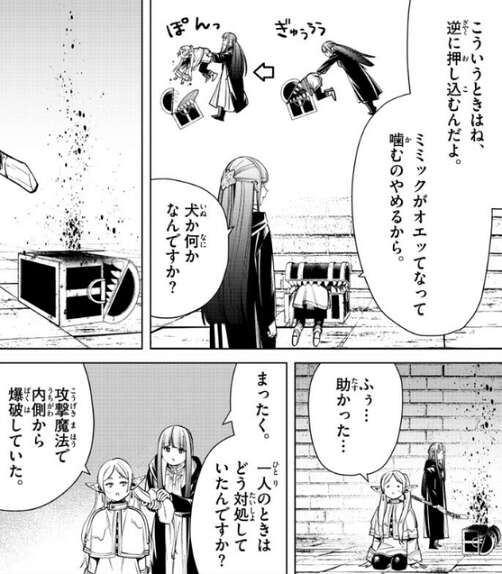 一方、前回ミミックの罠にかかってしまったフリーレンですが、フェルンが引っ張り出そうとしても駄目なようで、フリーレンはちぎれちゃうからいったん引っ張るのやめよ?と、フェルンに言います。こういうときはね、逆に押し込むんだよ、とフリーレンはフェルンに教えて、何とかミミックから脱出します。フリーレンはフェルンに怒られながらも、迷宮の攻略を進めます。