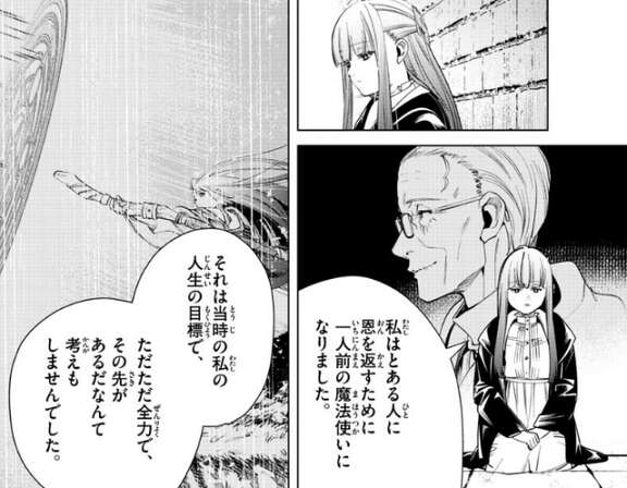 フェルンはフリーレンの事だと思いますが、ゼンゼが言っていたのはフェルンの事でした。フェルンが相当な修練を積んでいて優秀な魔法使いなのに、フェルンから情熱も執念も感じられないため、不思議な子だ、とゼンゼはフェルンに言います。すると、自分はとある人に恩を返すために一人前の魔法使いになった、きっとその時に情熱も執念も使い果たしてしまったのだろう、とフェルンはゼンゼに言います。