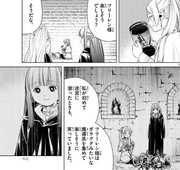 なら何故君は魔法の探求を続けているんだ?と、ゼンゼが聞くと、フェルンはフリーレンを見て、楽しそうでしょ?と、言います。そして、フェルンが初めて迷宮に潜った時もフリーレンはガラクタみたいな魔道具を集めて楽しそうに笑っていた、とゼンゼに言います。