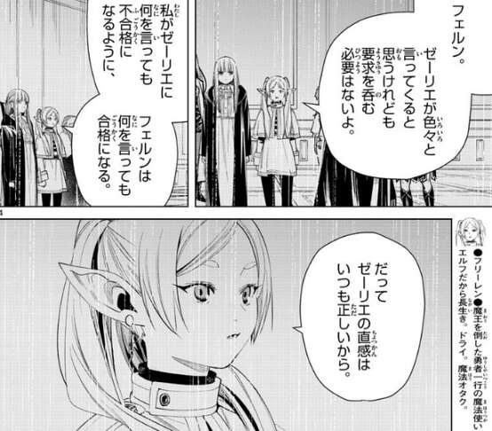 フェルンは面接前にフリーレンに、ゼーリエが色々言ってくると思うけれども、要求を呑む必要はないよ、と言われたことを思い出し、ゼーリエにフリーレンの弟子だと断言します。フリーレンは、フェルンは何を言っても合格になる、だってゼーリエの直感はいつも正しいから、と断言していました。