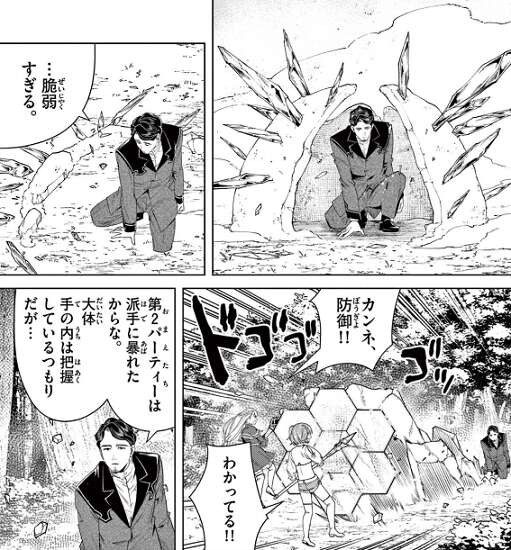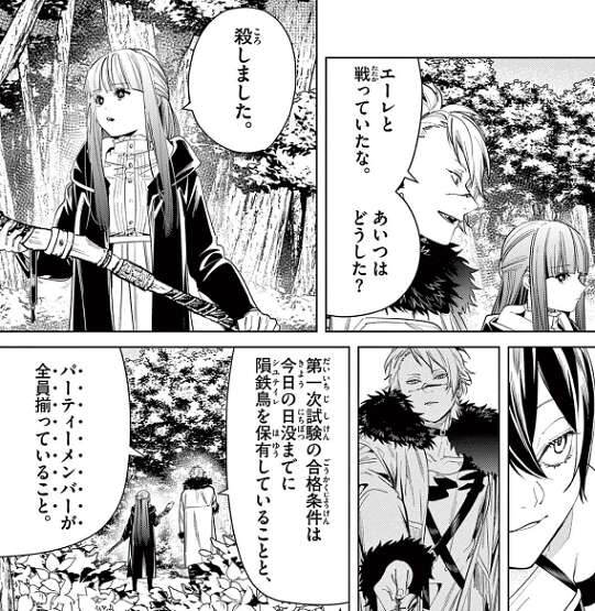 既に隕鉄鳥を捕獲していたフェルン達の第4パーティーは、ヴィアベル達の第8パーティーに襲われます。第8パーティーのエーレは“石を弾丸に変える魔法”(ドラガーテ)を使ってフェルンを攻撃しますがフェルンは全て防御魔法で防ぎ、逆に飽和魔法攻撃でエーレを圧倒します。