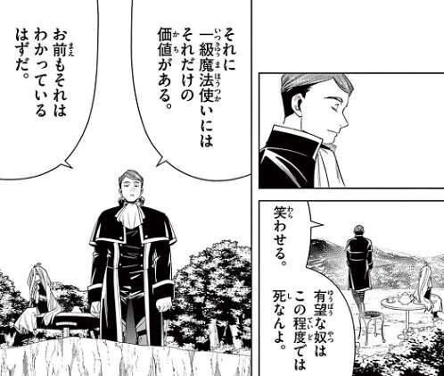 フリーレンはデンケンとラオフェンを倒して、隕鉄鳥を奪還すると、結界を破壊します。結界が破られ雨が降ってくると、カンネは水を操る魔法(リームシユトローア)で雨を操り、リヒターを攻撃しようとします。カンネはラヴィーネに、逃がさないようにね、と注意しますが、カンネの攻撃は圧倒的な質量攻撃を前に、リヒターにはそもそも逃げ場はありません。