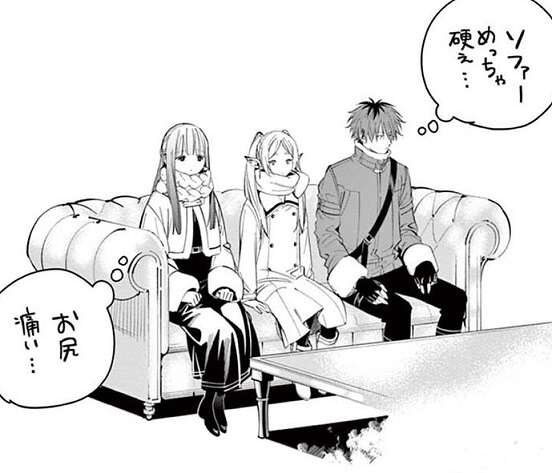 第86話で話し合いの席に着いたフリーレン一行ですが、黄金郷のソファーは(黄金なので)やっぱりめちゃくちゃ硬いようです。フリーレン達は何ともない顔をしていましたが、内心はお尻がすごく痛かったようです。
