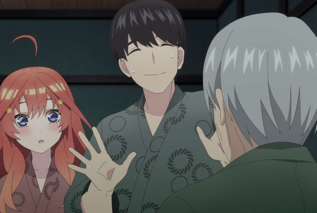 一方、部屋を抜け出した二乃は呼び出した風太郎を待ちますが、そこに現れたのは風太郎ではなく中野父親でした。場面変わって、風太郎はおじいちゃんに五つ子たちの見分け方のコツを教えてもらおうとしますが結局、愛があれば見分けられる、としか教えてもらえません。