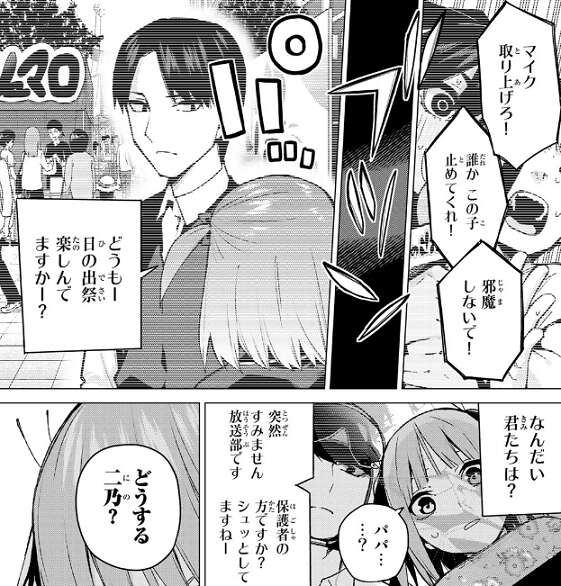 が、この計画が風太郎の計画と知り、家庭教師の範疇を超えていると途端に不機嫌になります。しかし、それが私に出来なかったことだと言い、風太郎に家庭教師を頼んでよかったと心から思うと父親に言ってもらえます。そして親として、風太郎が娘たちとの関係を真剣に考えてくれることを願うと言われます。