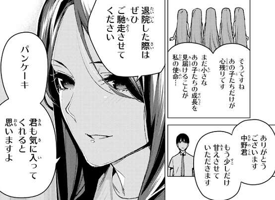 父親は五人から距離を置くことで、受け入れがたいあの人の死を避けていたのかもしれないと思いつつ、パンケーキを食べます。パンケーキを食べた父親は、次は家族全員で食べようと言います。父親に家族で一緒に食べようと言ってもらい、受け入れてもらえ喜ぶ二乃と風太郎です。二乃と父親の関係が良い結果になって、ひとまずトイレに席を立つ風太郎です。