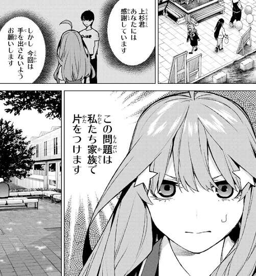 自分の意思で母を目指すと決めた五月は、風太郎には手を出さないように言い、自分たち家族だけで問題に片をつけると決心します。