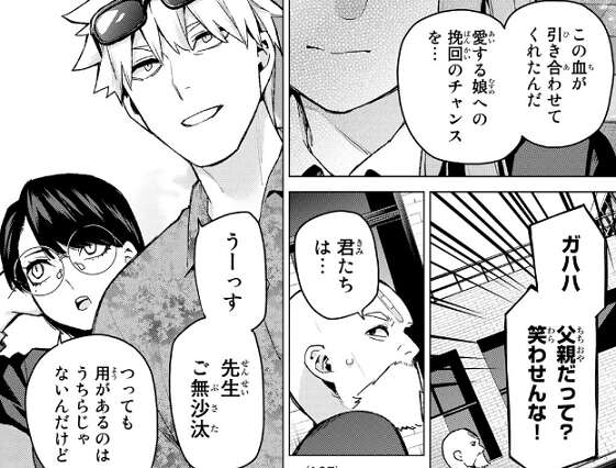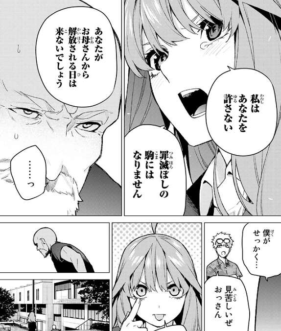 中野父からも、零奈が子供たちにどれほど希望を見出したのかを逃げ出してしまったあなたは知らないと言い、零奈を語る資格はないと断言します。五月は無堂に最後までお母さんにへの謝罪がありませんでしたね、私はあなたを許さないと言いベーをして無堂を追い返します。