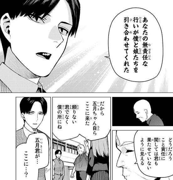 しかし中野父はここには五月はいないと言うと、柱の陰から五月が現れます。無堂が五月だと思っていたのは五月に変装した三玖でしたが、無堂はただ間違えただけだと言います。しかし、五月は愛があれば私たちを見分けられるという母親の言葉を持ち出しますが、無堂はいい加減にしろと怒り、母親の事はすぐに忘れるように言います。