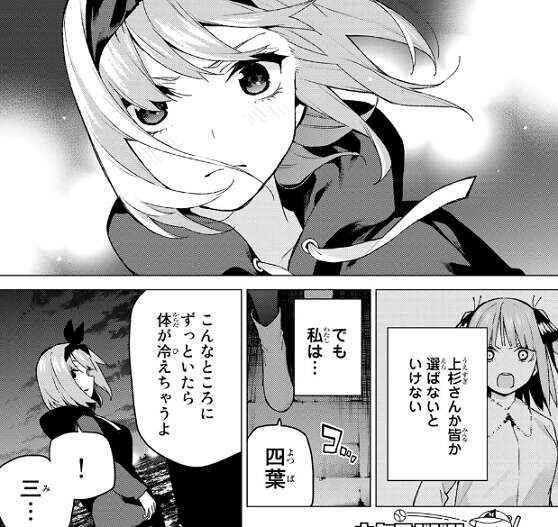 それに対して三玖は、私が選ばれないのなら四葉になり変わって、自分がフータローと付き合う作戦だと四葉に答えます。あまりの三玖のぶっ飛んだ作戦に絶句する四葉です。