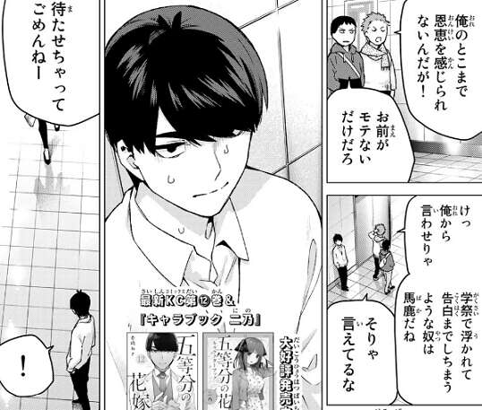 学園祭も終わり、風太郎が誰かと待ち合わせをしていると通りがかりの学生が、学際で付き合いだすカップルが多いという噂をして盛り上がっています。風太郎がその噂を耳にして顔に汗を浮かべていると、待ち合わせ相手が到着します。