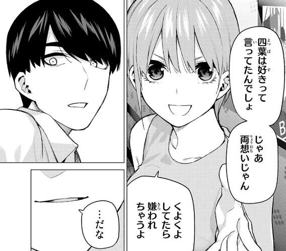 一花が四葉から何も聞いていないようだったので、風太郎は念のため一花に聞いていないか確認します。すると、昨日は久々に父親と一緒に食事だったから風太郎のことはあんま話題に上らなかったと聞かされます。話の流れ上、一花から何があったか質問され仕方なく、風太郎は四葉が俺のことを好きだと言ってくれた事を話します。興味津々で食いついてくる一花は、その後どうなったかさらに質問してきます。すると風太郎は、その後四葉からまだやらなくちゃいけないことがあります、と言われて実は風太郎と四葉はまだ付き合っていないこと、やべー地雷を踏んだかもしれないと不安になっている事を一花に告白します。