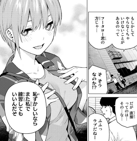 その後、バトミントンをした帰り道、風太郎から四葉に好きとちゃんと言っていないという話題から、一花は風太郎に恥ずかしいならまた私で練習してもいいんだぞ、と自分で好きと言う練習をしてもいいと風太郎をからかいます。自分は本気で悩んでいるんだぞ!と風太郎はからかってくる一花に抗議します。