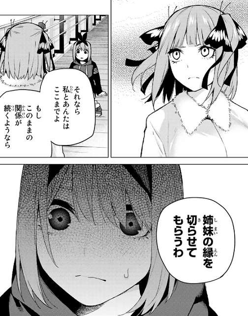 今 あんたに心配なんかされたくないわ!と怒る二乃に、二乃は大切な家族だから心配だよと四葉は言います。そんな四葉に怒った二乃は、もしこのままの関係が続くようなら姉妹の縁を切ると言い放ち、四葉の顔は青ざめます。