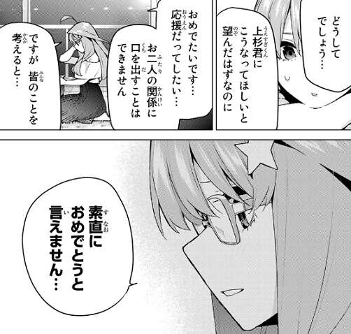 一花はマンションに戻ってきますが、いたのはリビングで勉強をしている五月だけで他の姉妹はまだ外出したままでした。五月に風太郎と四葉の二人はまだ付き合っていない事を伝えると、応援したいと言いつつも二人の関係に口を出すことは出来ないと言います。そして、皆の事を考えると素直におめでとうと言えません…、と五月は呟くように言います。