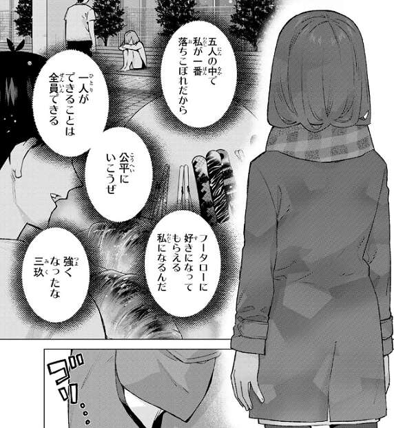 私達のことは気にしないで付き合っていいんだよと三玖が言い四葉は驚きますが、その直後に続けて三玖がなんて言うと思った?と言います。三玖はどうしても感情が荒立ってしまう、それだけ本気だったと言い、私たちのこの感情も受け止めてほしいと四葉に想いを伝えます。